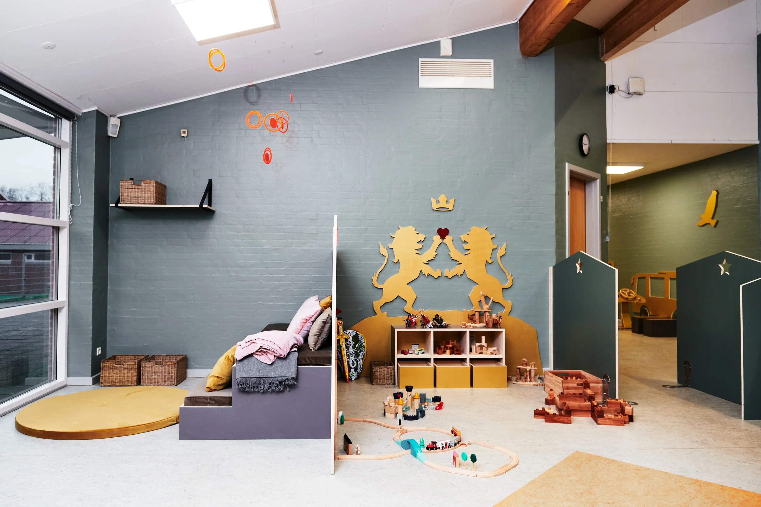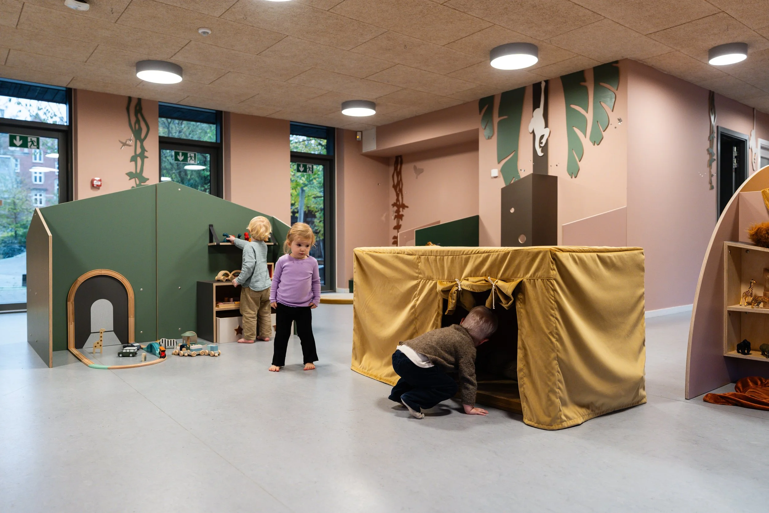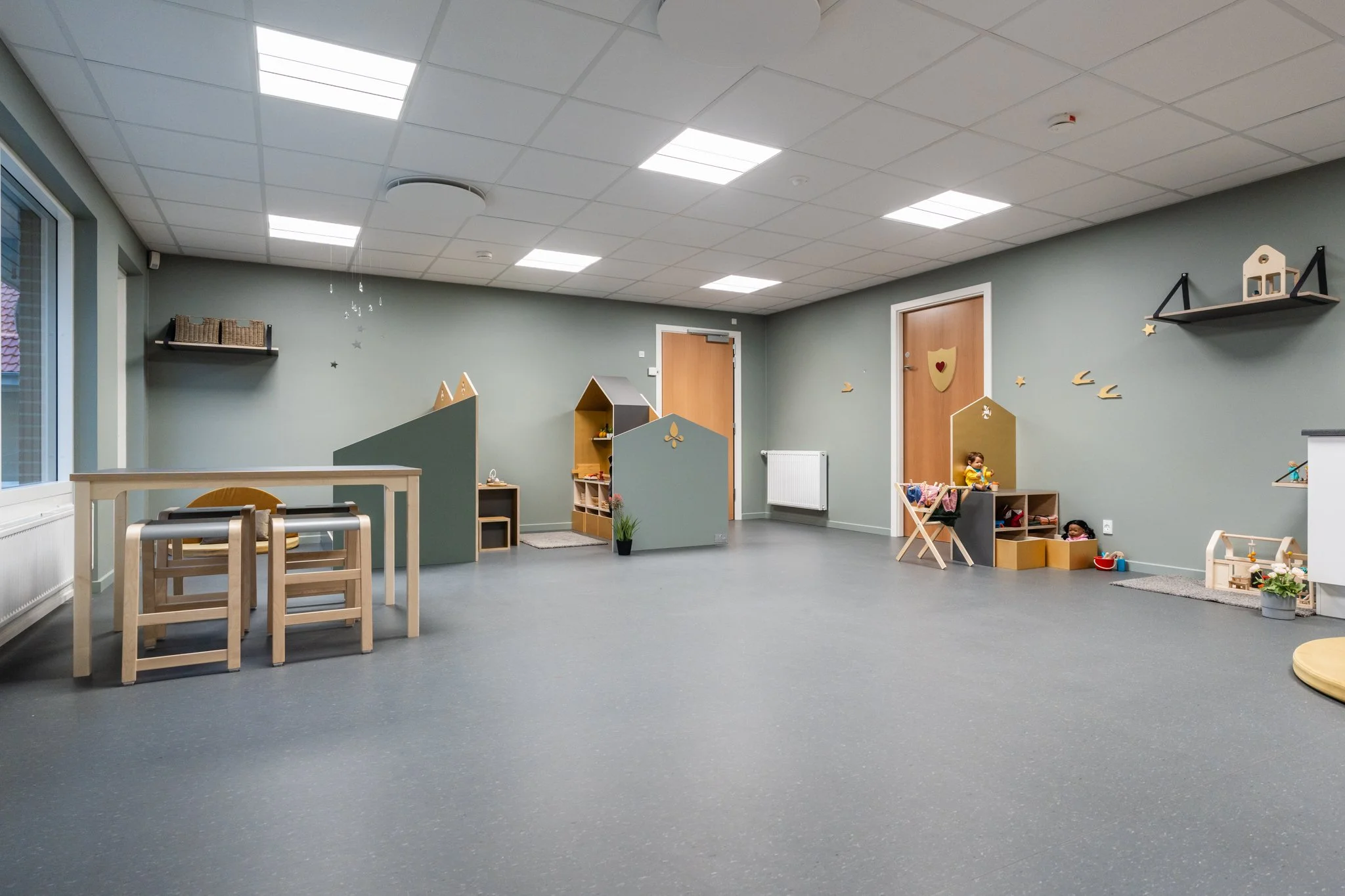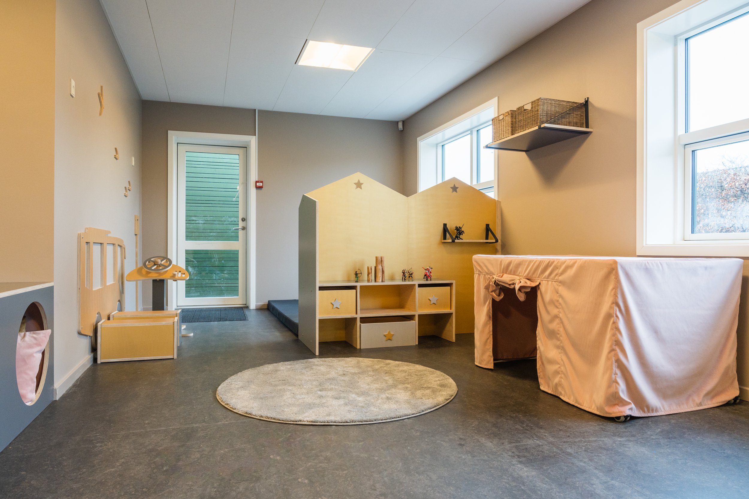 Det er rum, hvor man føler sig velkommen og hjemme. Rum hvor farver, materialer og rolige overgange hjælper med at sænke nervesystemet. Det er tydelige og inspirerende miljøer, der inviterer til leg og giver plads til både fordybelse og fællesskab. Afgrænsede zoner gør det muligt for mindre grupper at lege side om side, samtidig med, at der altid er et sted at trække sig tilbage og finde ro.