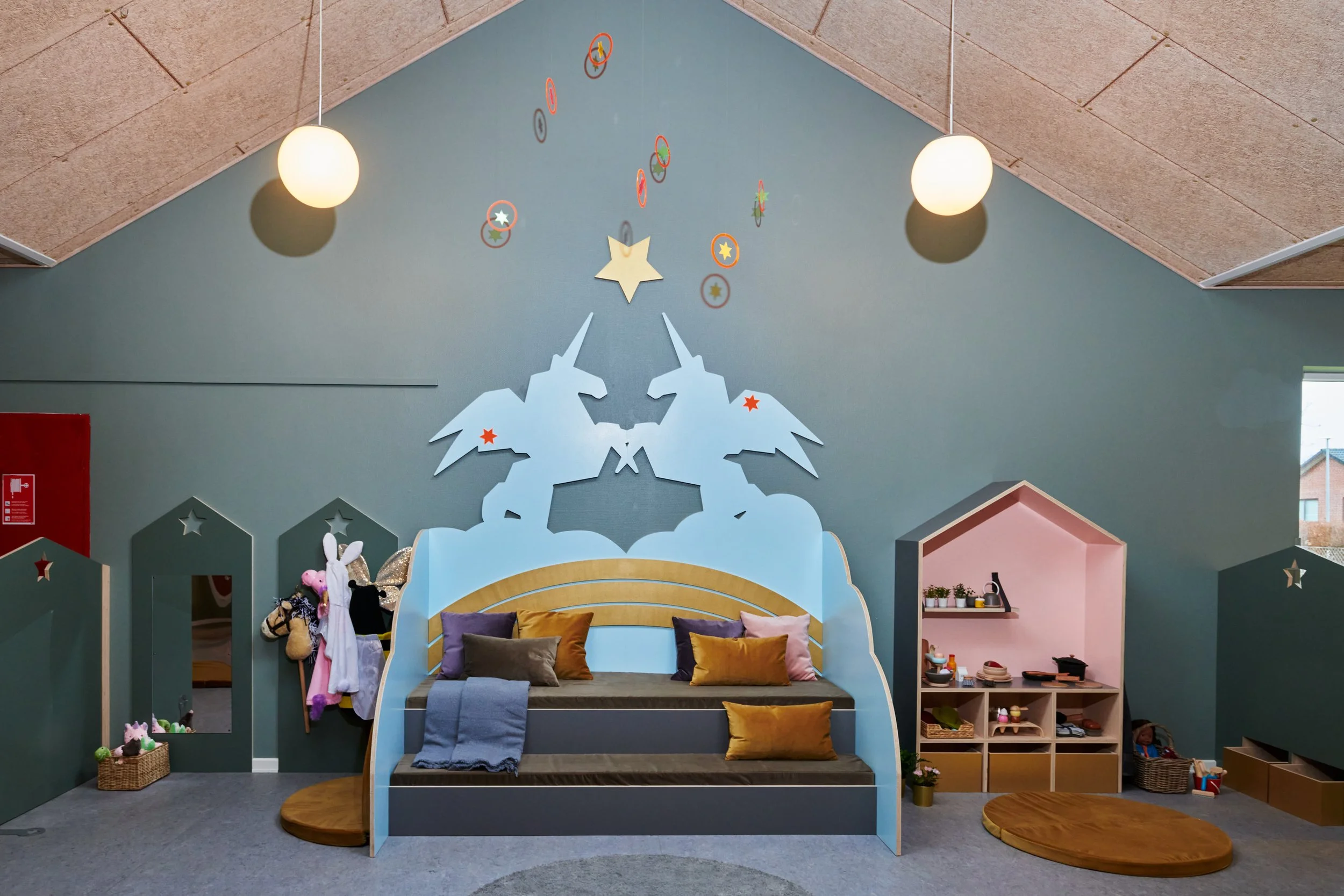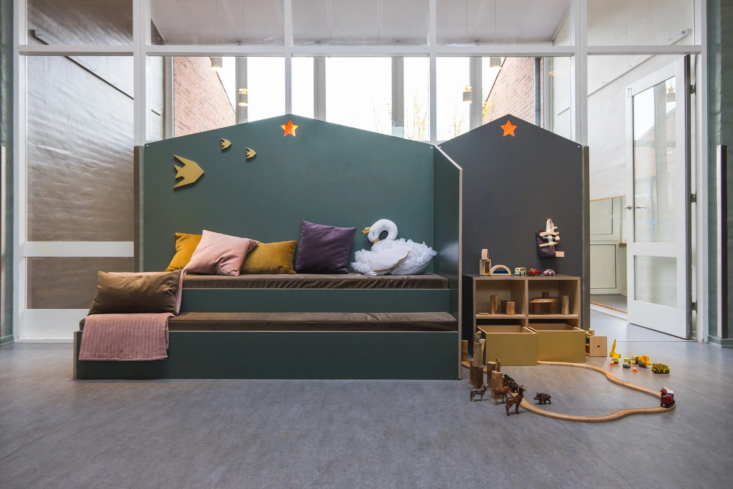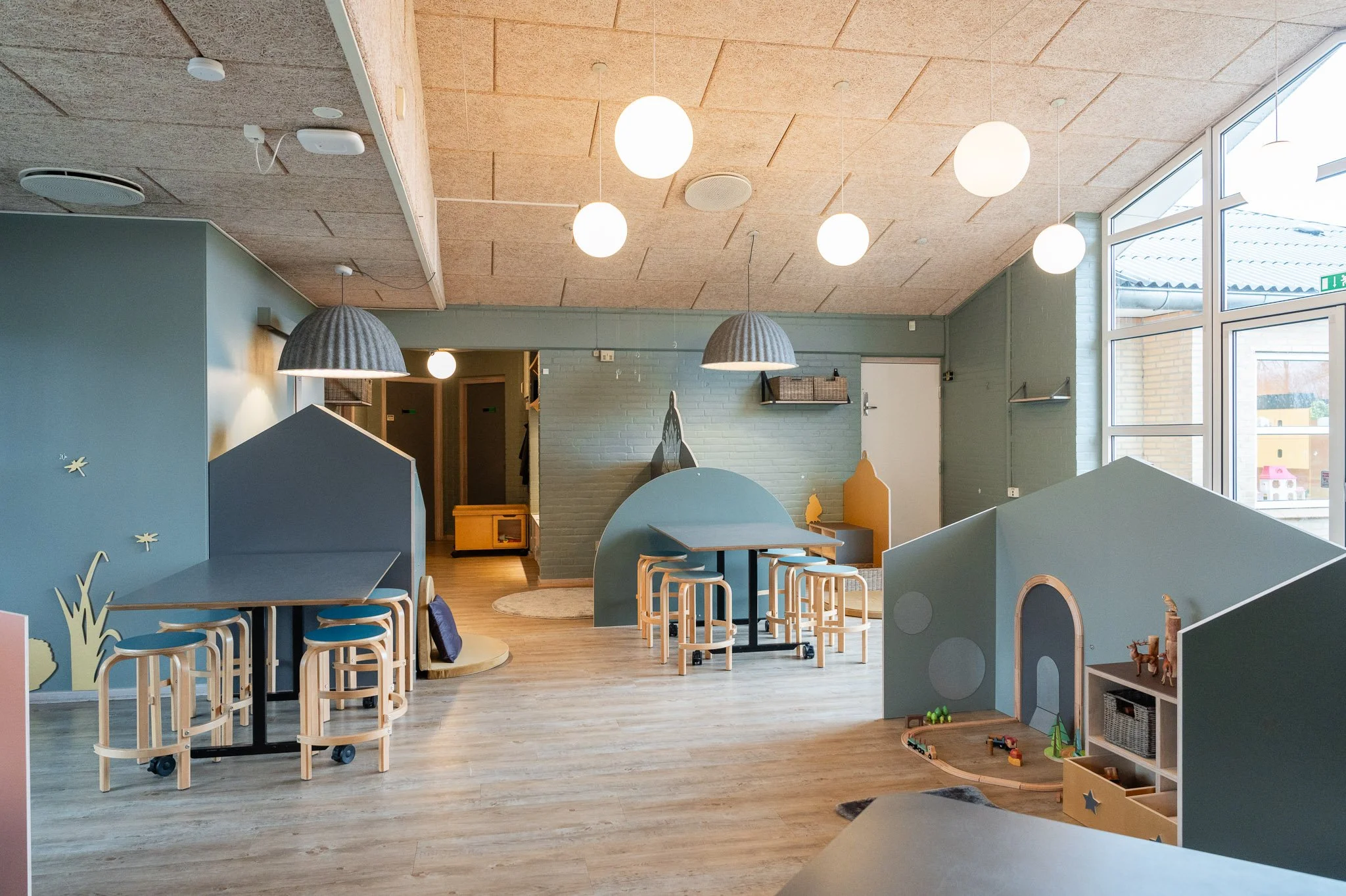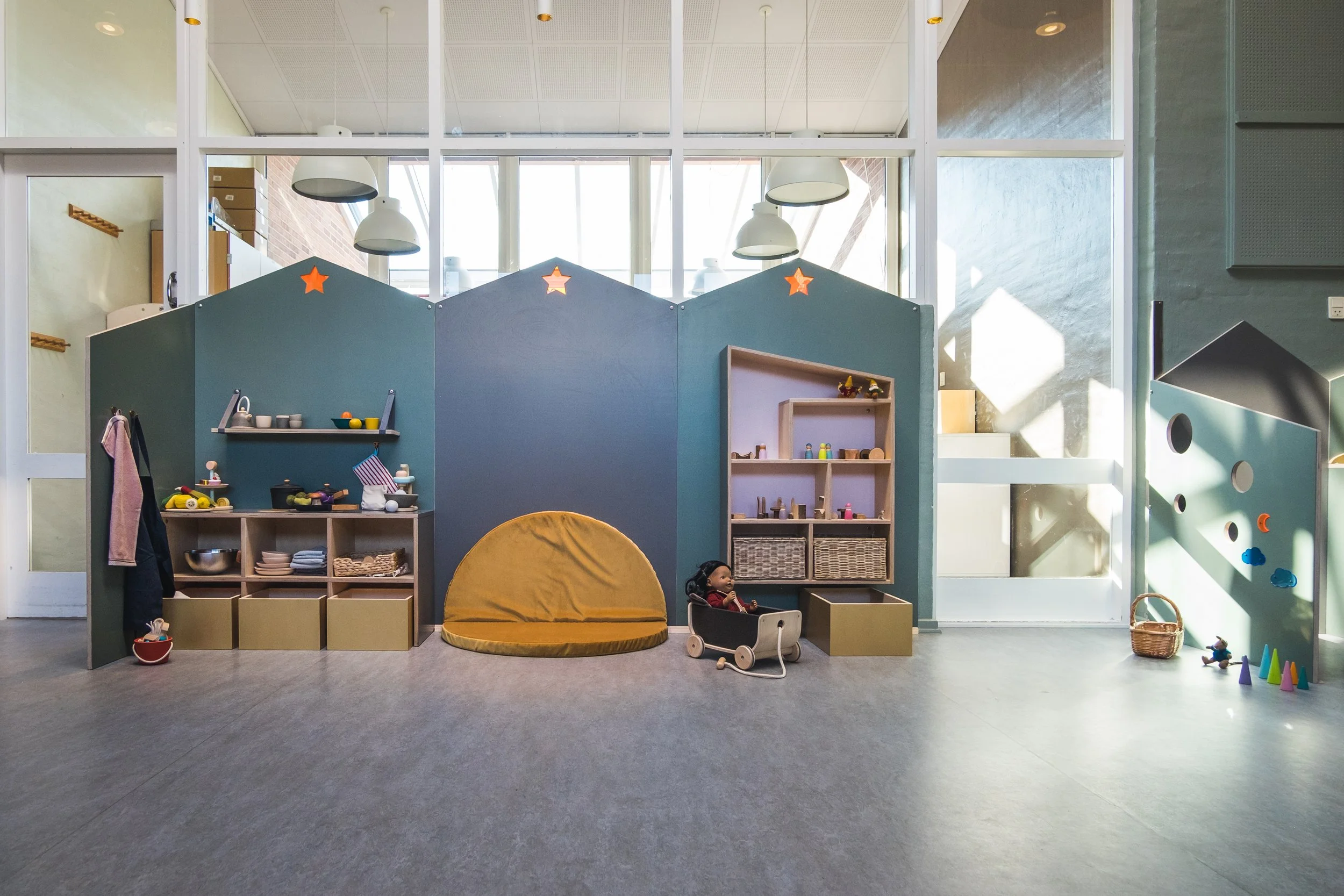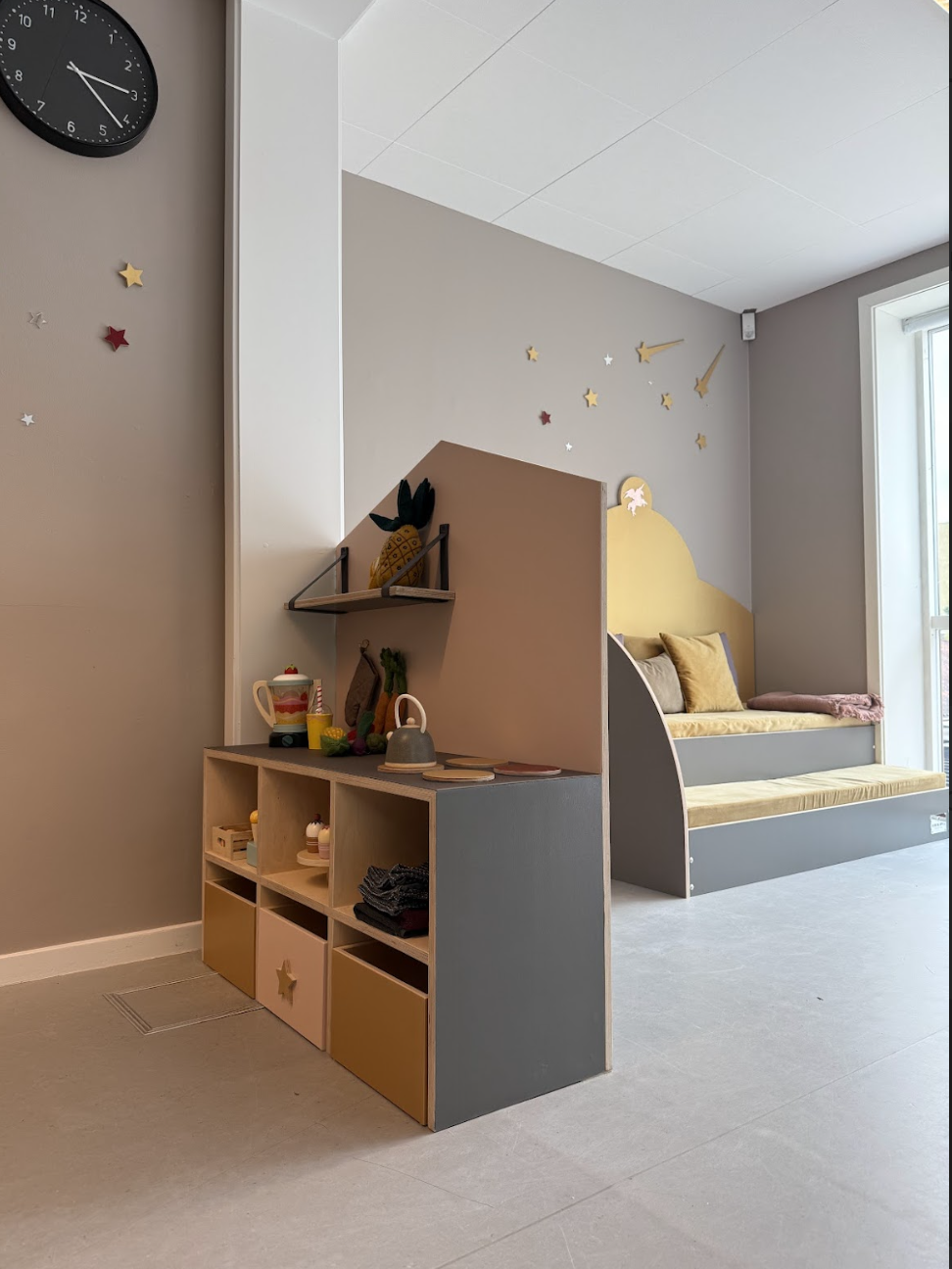 Det er rum, hvor man føler sig velkommen og hjemme. Rum hvor farver, materialer og rolige overgange hjælper med at sænke nervesystemet. Det er tydelige og inspirerende miljøer, der inviterer til leg og giver plads til både fordybelse og fællesskab. Afgrænsede zoner gør det muligt for mindre grupper at lege side om side, samtidig med, at der altid er et sted at trække sig tilbage og finde ro.