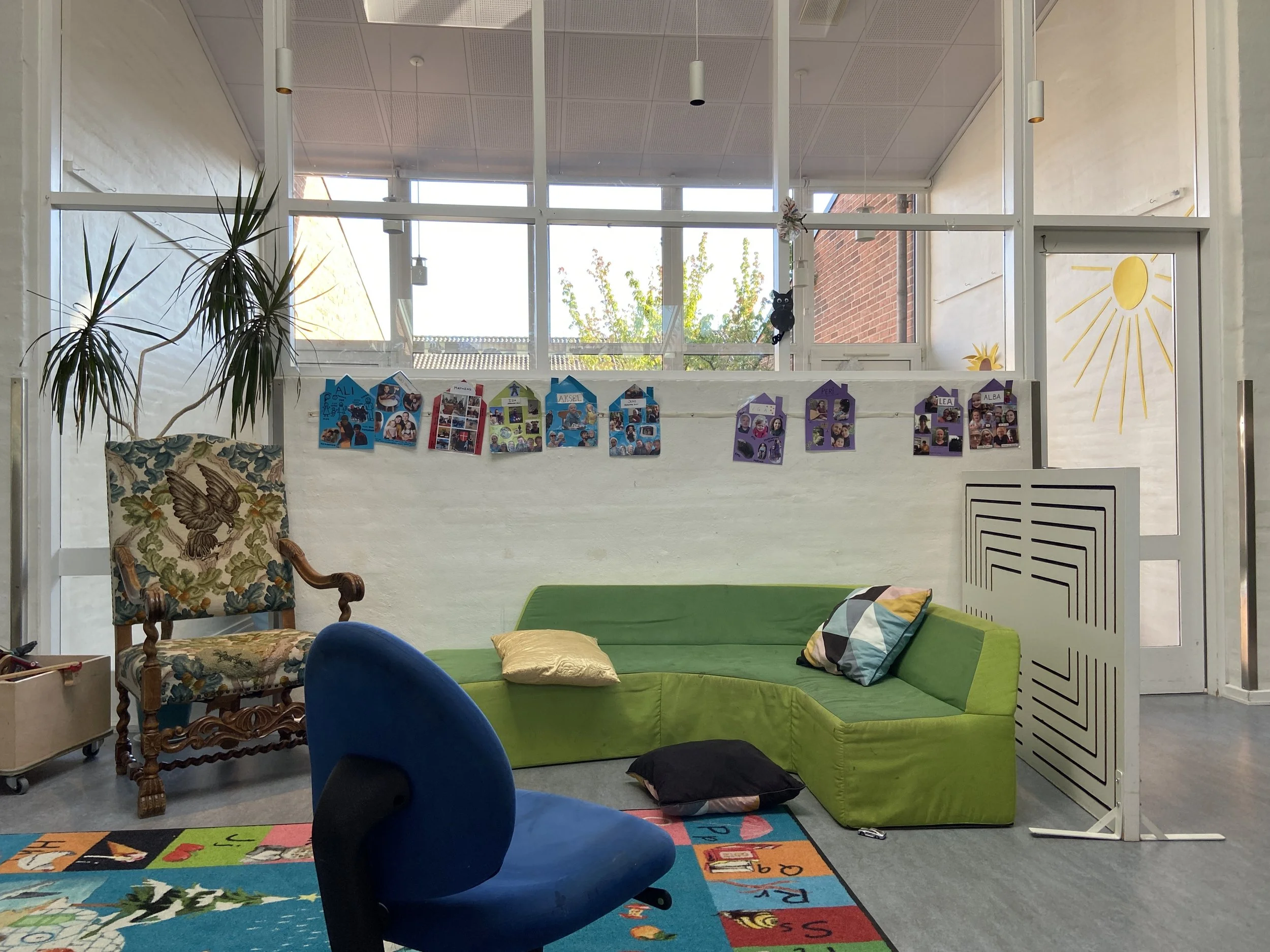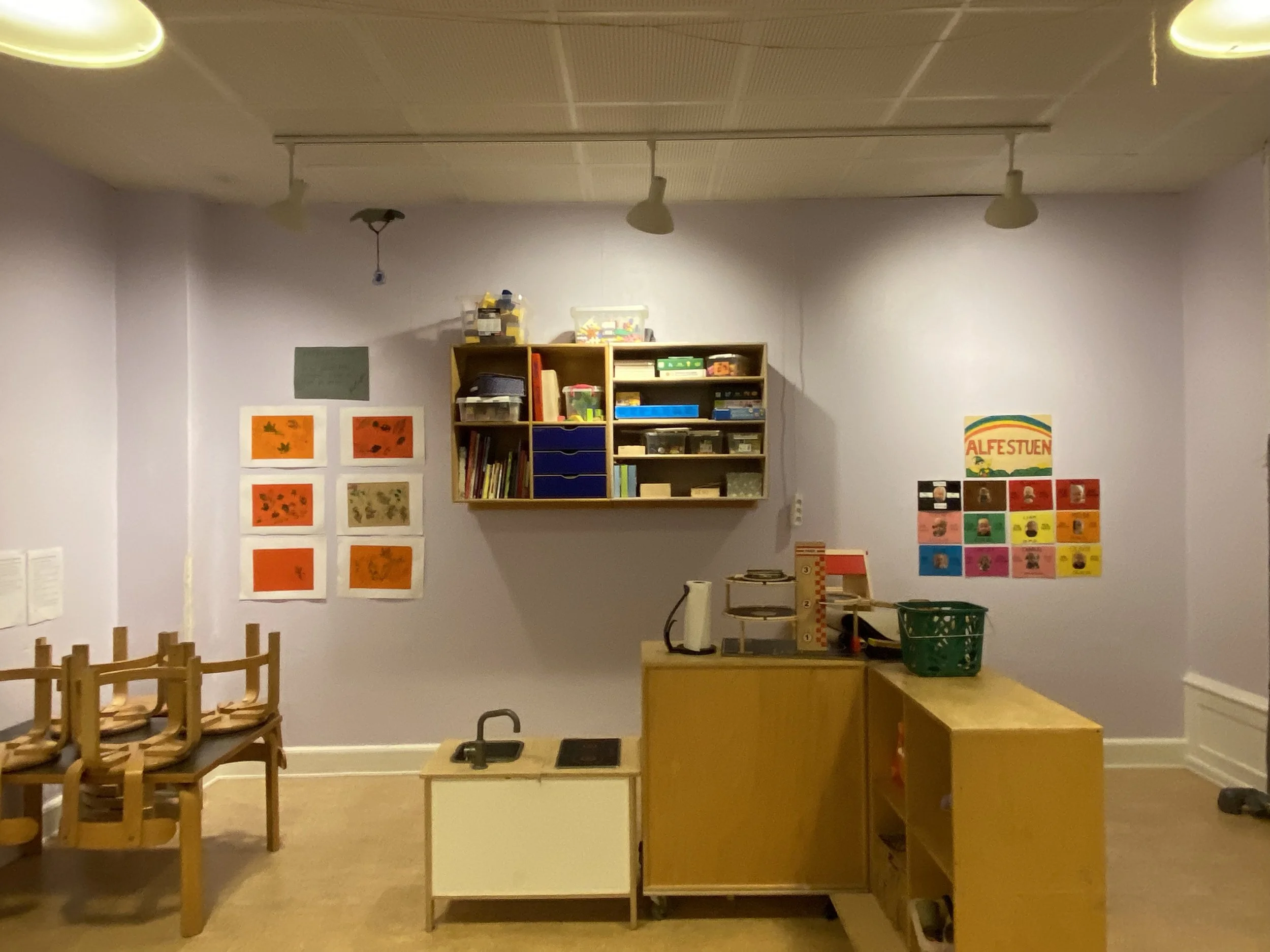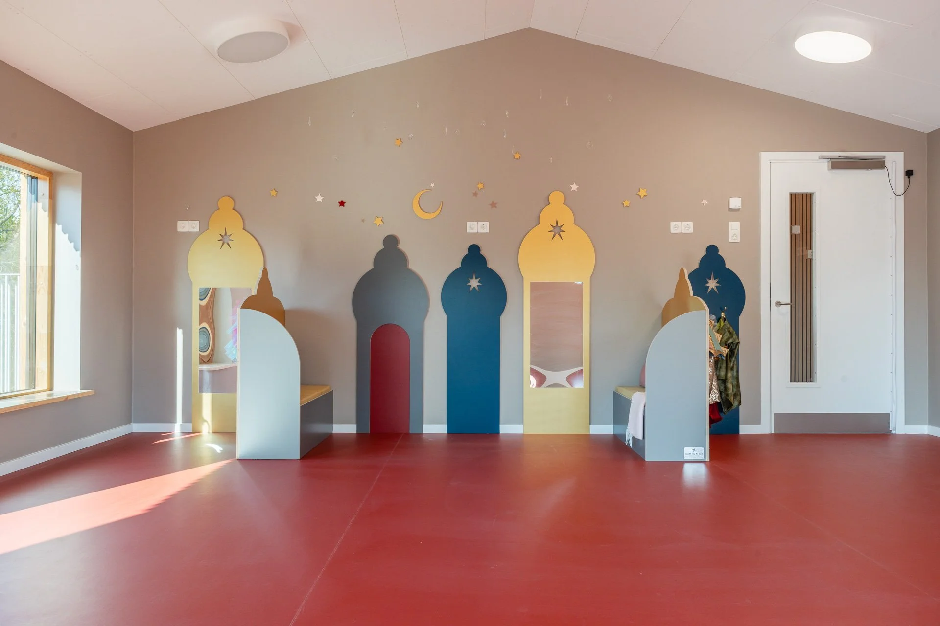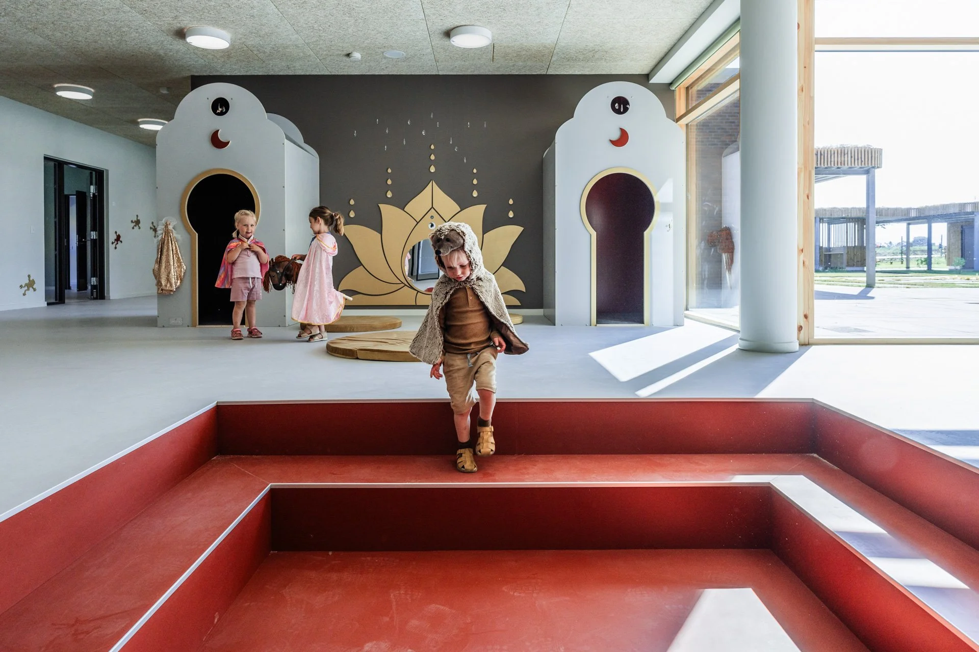 Det er rum, hvor man føler sig velkommen og hjemme. Rum hvor farver, materialer og rolige overgange hjælper med at sænke nervesystemet. Det er tydelige og inspirerende miljøer, der inviterer til leg og giver plads til både fordybelse og fællesskab. Afgrænsede zoner gør det muligt for mindre grupper at lege side om side, samtidig med, at der altid er et sted at trække sig tilbage og finde ro.